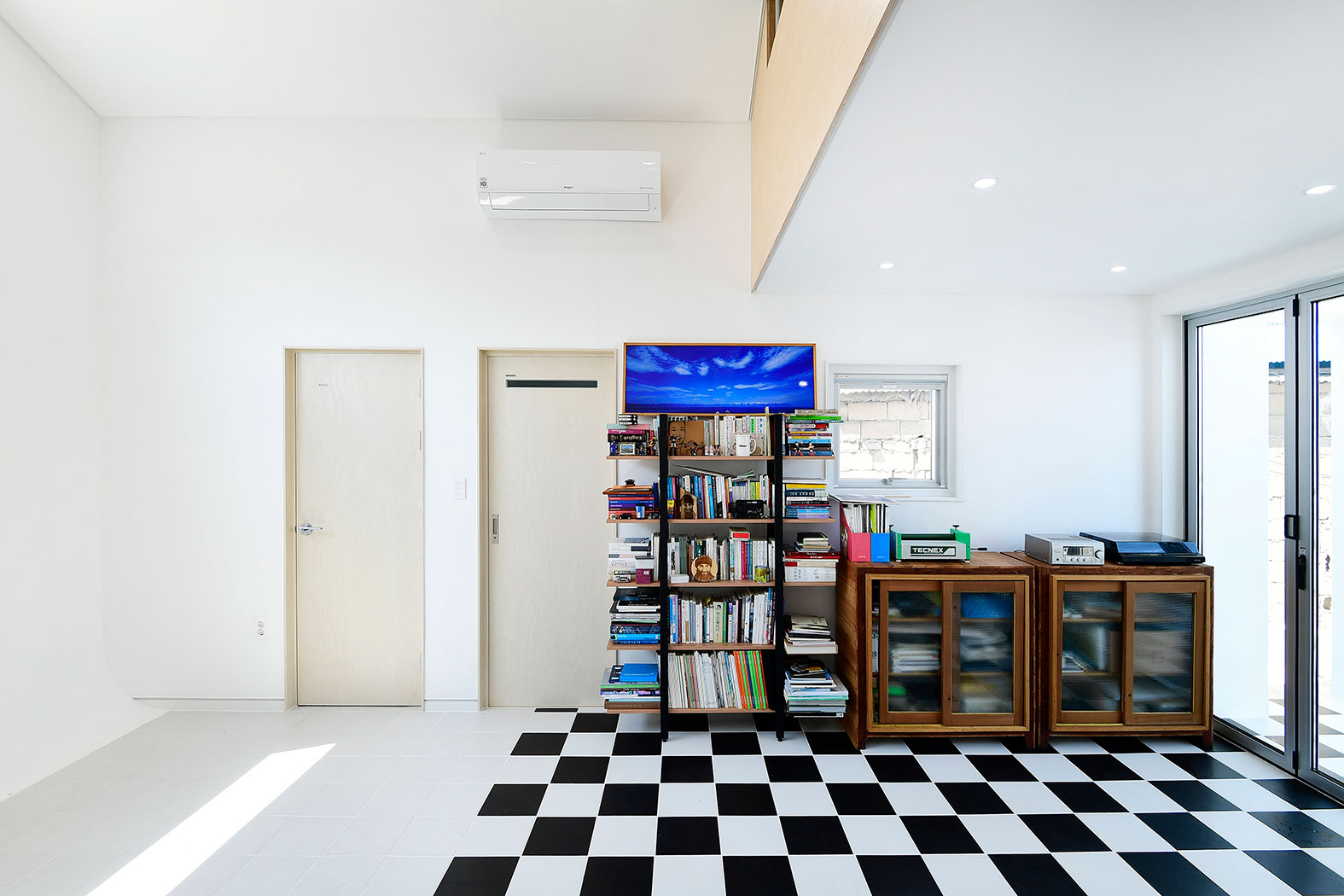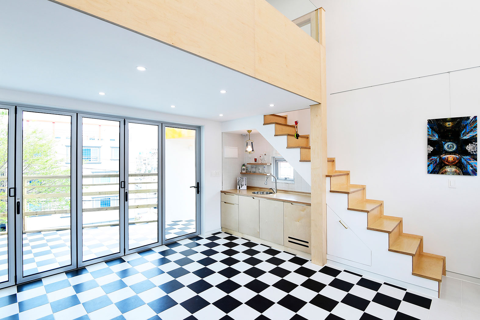 폴딩도어를 열면 전면에 촬영공간이 있고 좌측으로는 다락으로 올라가는 계단이, 계단하부는 싱크대, 우측으로는 화장실과 창고를 계획했다. 다락은 편집 작업이나 편히 쉴 수 있는 공간이다. 노란색 출입구 위로는 다락에서 나갈 수 있는 작은 발코니도 있어서 바깥의 전망과 외부의 바람도 느낄 수 있다.