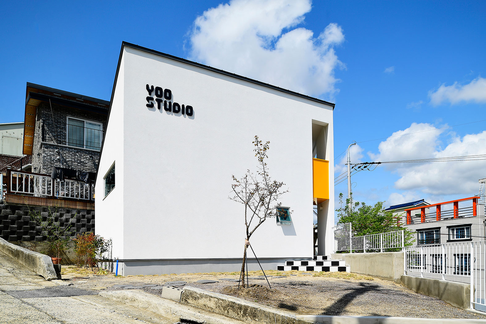 전체적인 매스는 최대한 단순하게 box형태로 계획했다. 외장재는 마치 사진의 배경을 상징하듯 백색의 스터코 플렉스를, 출입구 부분은 노란색의 알루미늄 쉬트로 입구를 상징함과 동시에 매스에 경쾌함을 더했다. 주변의 복잡한 풍경 속에서 작지만 깨끗한 모습으로 바라봐주시길 바라면서.