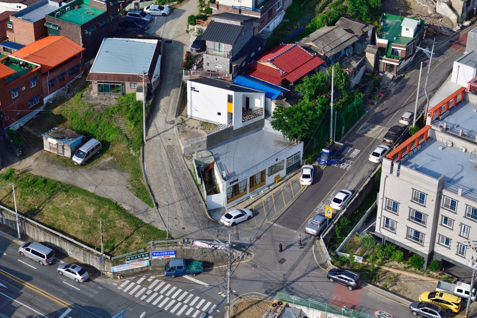 작년 봄 지인인 사진작가 분으로부터 설계의뢰를 받았다. 급경사의 대지 지하엔 아내분이 운영하시는 리모델링한 분위기 좋은 카페건물이 자리하고 있었다. 아마도 예전에 산이었을 법한 땅이라 그런지 지반은 꽤 건고해 보였다. 남측이 높고 북측이 낮은 지형이고 북측으로는 진주시의 오래된 도시풍경이 파노라마처럼 펼쳐져 있다.