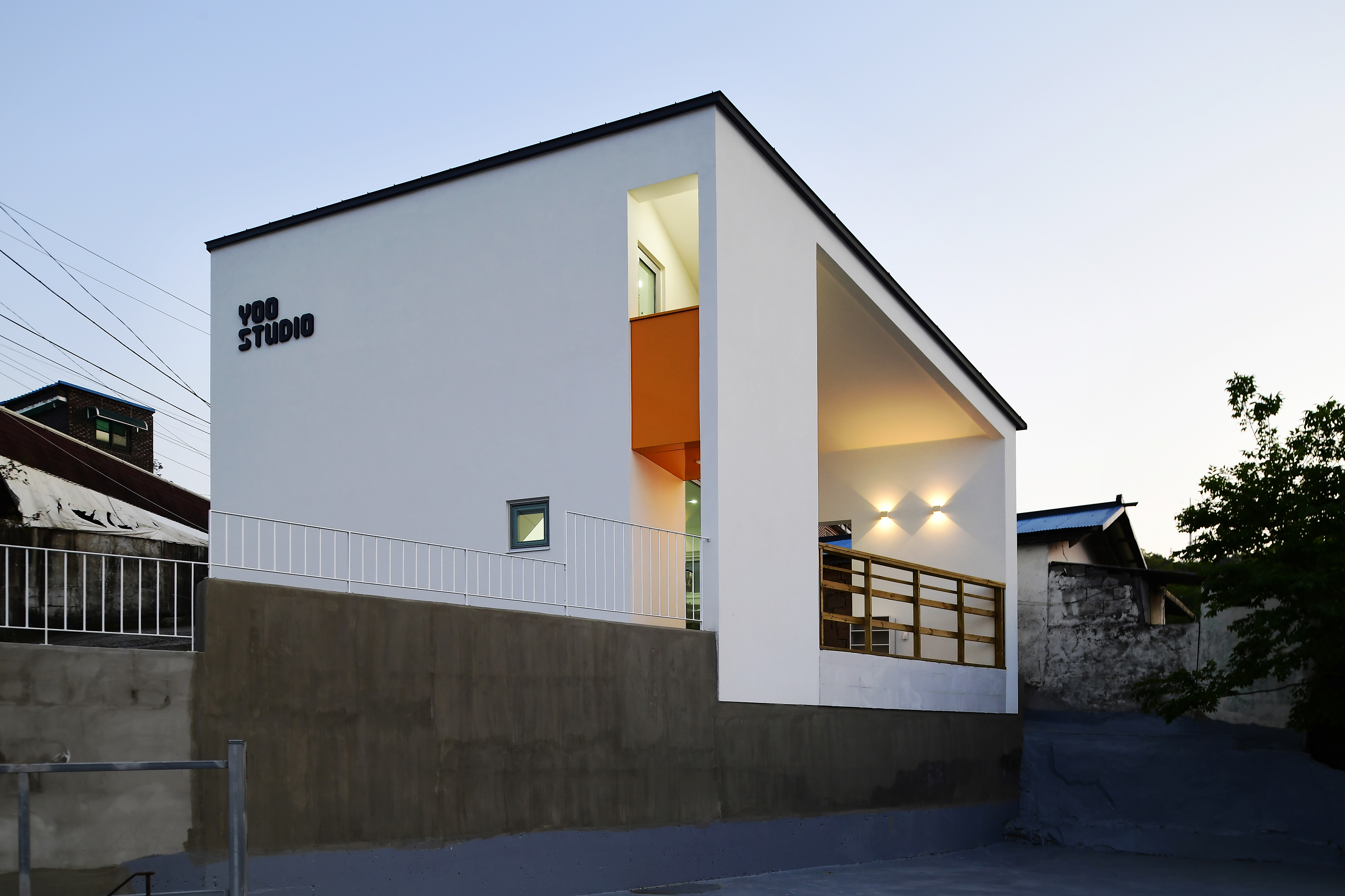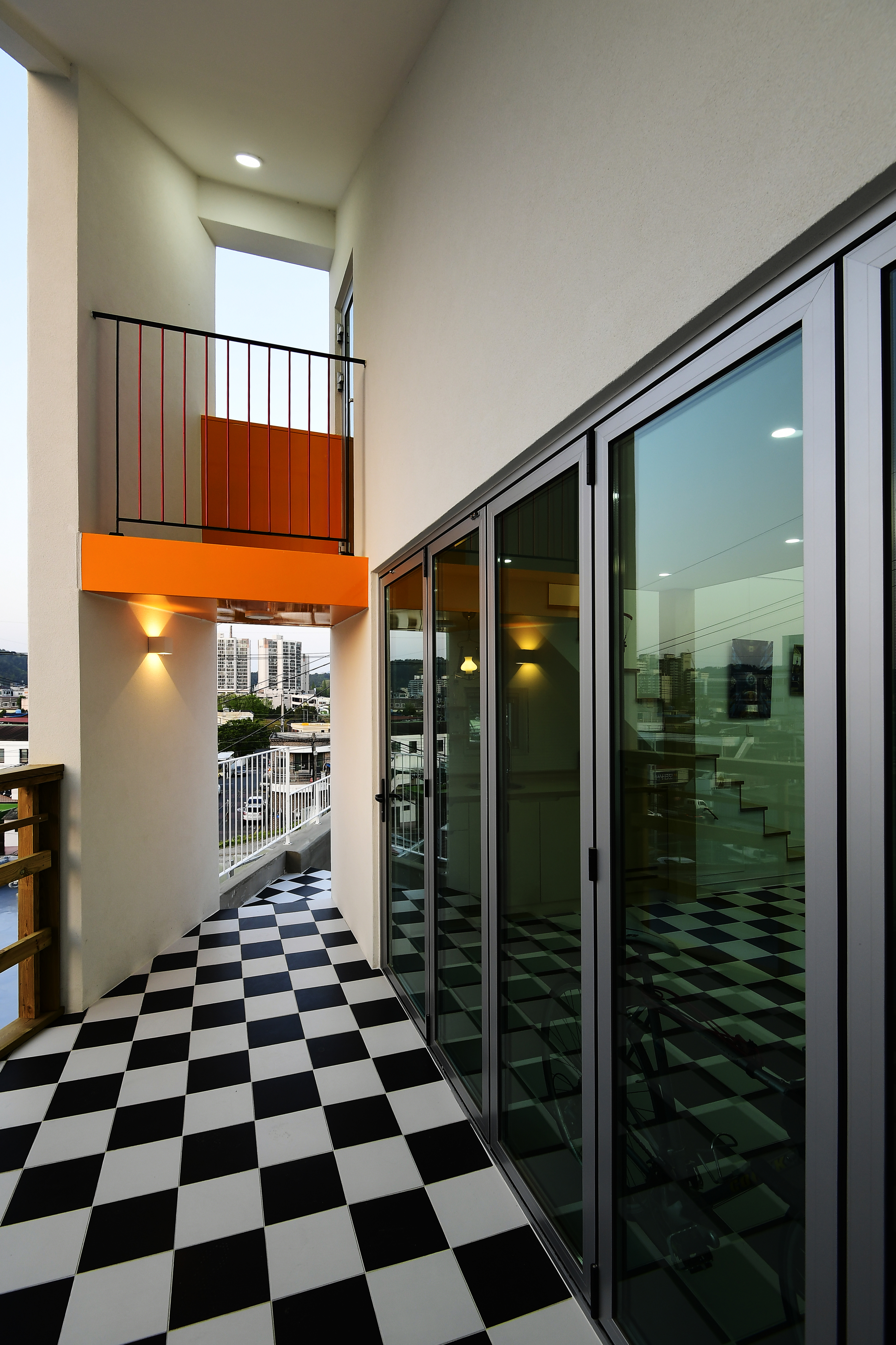 출입은 급경사인 도로에서 카페 출입과는 별도로 이루어진다. 노란색 하부를 지나면 비 안 맞는 외부공간을 만나는데 일종의 내외부 공간을 잇는 전이공간으로 폴딩도어를 열면 내부공간이 확장되어 사진작품의 전시회를 하거나, 프로젝터를 걸면 회의나 영화도 볼 수 있다. 스튜디오지만 그야말로 다양하게 활용함으로써 지역의 예술인들이 모이는 아지트 같은 문화공간으로도 기대를 해본다. 지금은 시공되지 않았지만 스튜디오와 카페를 잇는 회전하는 데크로도 진입이 가능하다. 데크는 걸터앉기 좋은 높이로 계획하여 도시로의 전망과 야외공연을 편안히 즐기도록 했다.