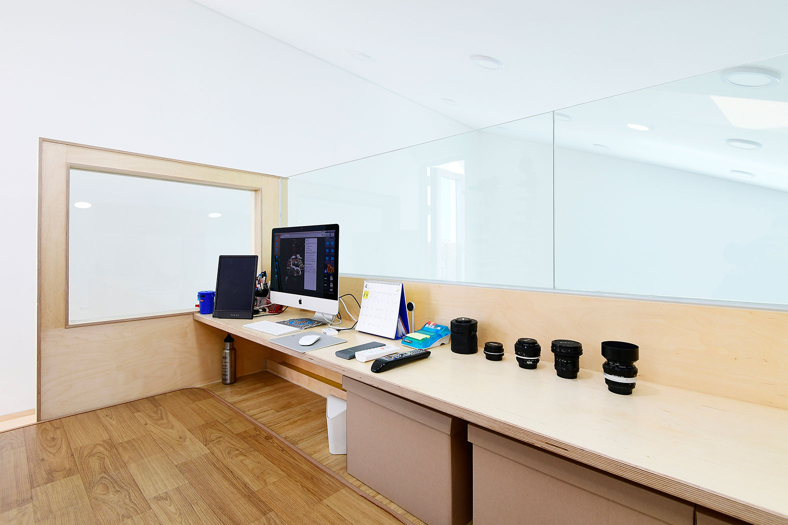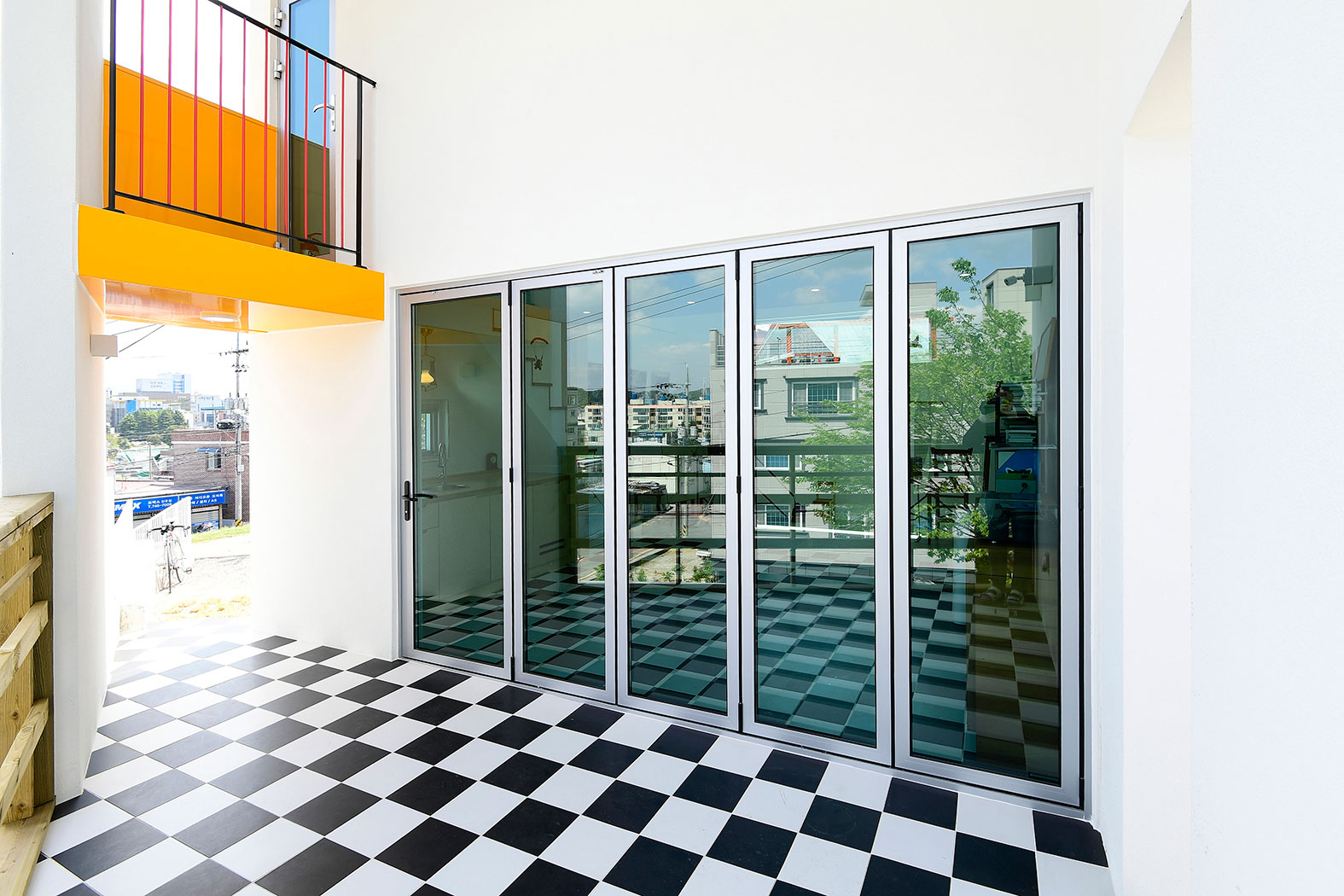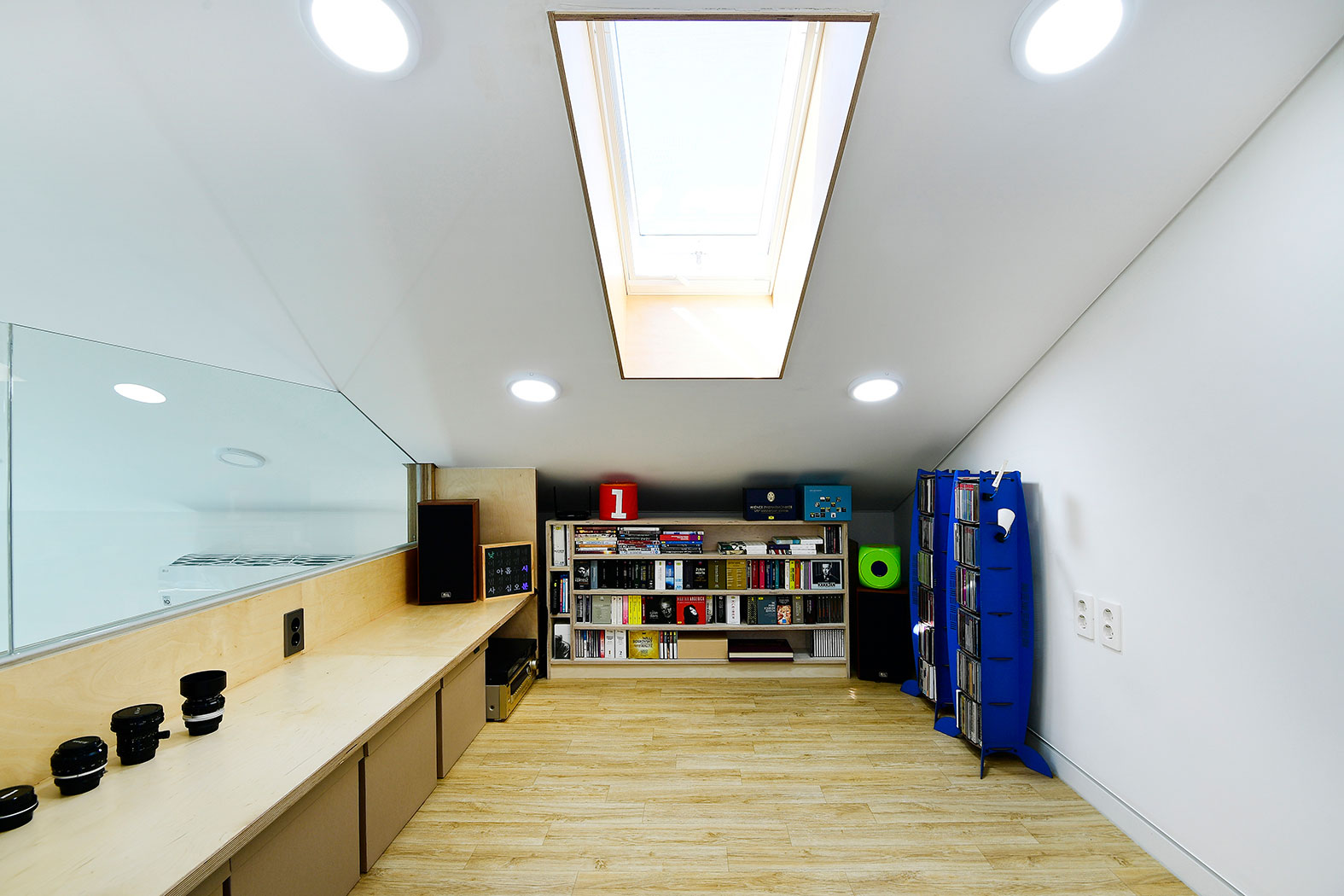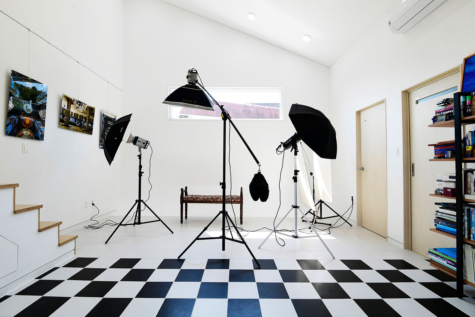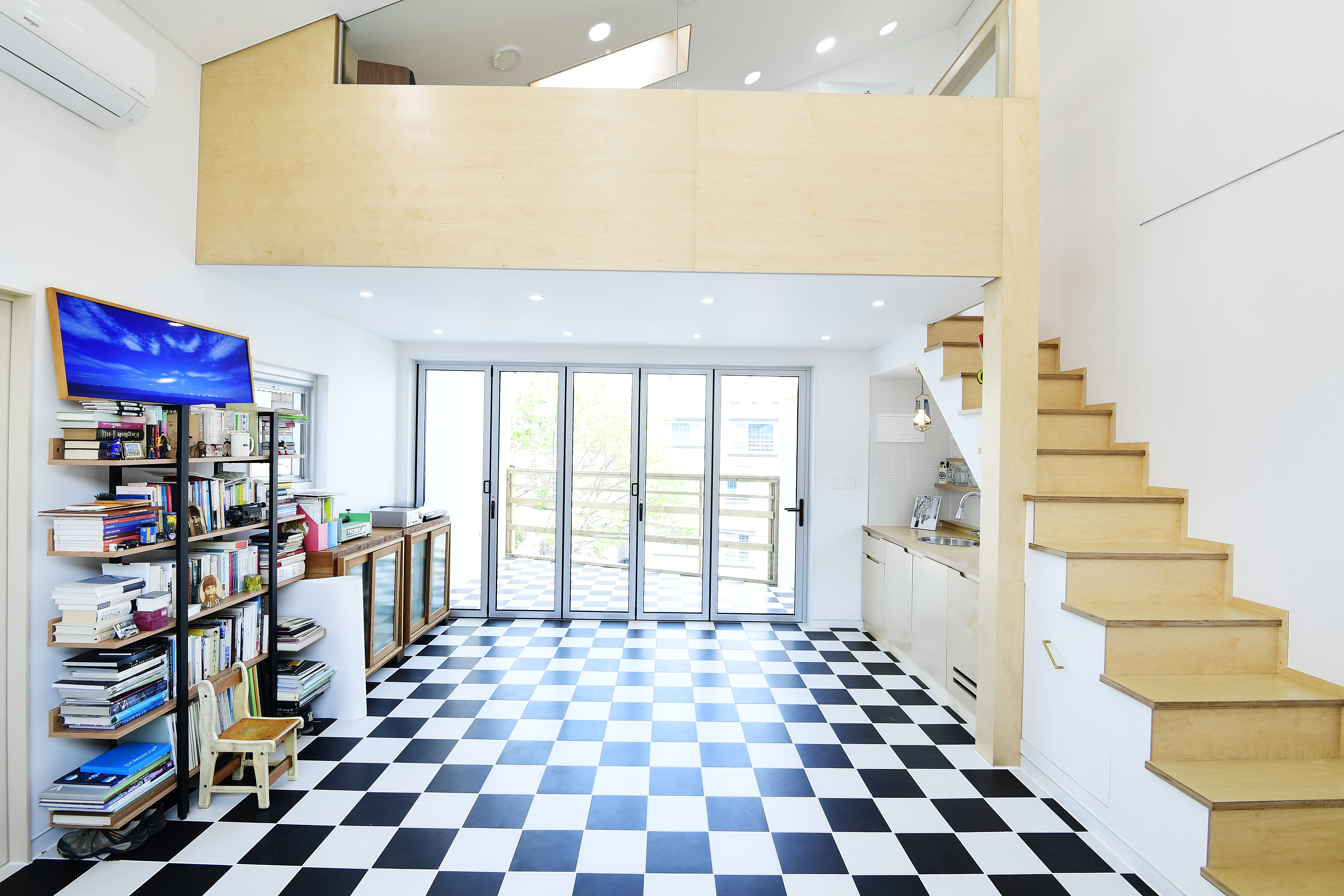 폴딩도어를 열면 전면에 촬영공간이 있고 좌측으로는 다락으로 올라가는 계단이, 계단하부는 싱크대, 우측으로는 화장실과 창고를 계획했다. 다락은 편집 작업이나 편히 쉴 수 있는 공간이다. 노란색 출입구 위로는 다락에서 나갈 수 있는 작은 발코니도 있어서 바깥의 전망과 외부의 바람도 느낄 수 있다.
