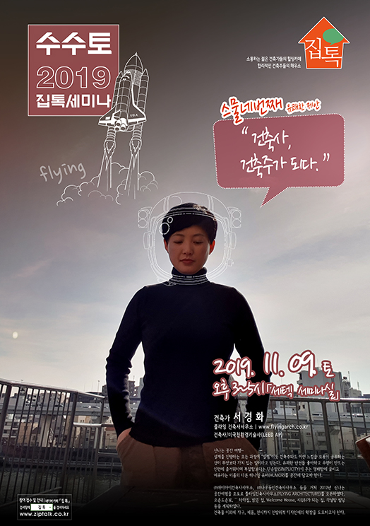 한 명의 건축사가 자신의 주제를 선택하여 총 26회에 걸쳐 진행되는 토크쇼. <집톡 수수토 세미나>의 24번째 순서로 플라잉건축사사무소의 서경화 소장이 진행하는 건축토크쇼가 11월9일 세텍 세미나실에서 열렸습니다.
