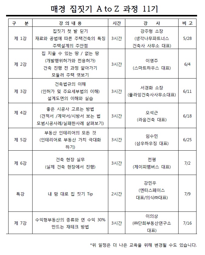 집 짓기에 관심 있는 일반인, 예비 건축주를 대상으로 한 매경 집짓기 A to Z 과정 11기(2019년 5월 28일~2019년 7월 16일)에 강사로 참여했습니다.