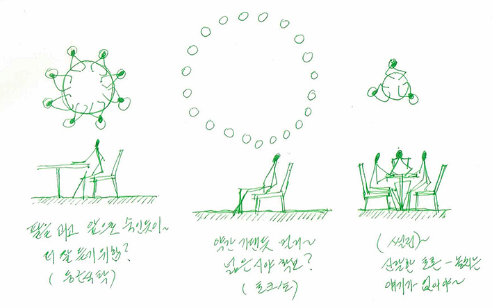 위의 두 가지 느낌엔 사실 많은 다름이 있다. “둥근 식탁”이 앉혀진 공간은 아늑했고 은은한 조명이 서로를 부드럽게 비추어 주었으며 사선의 천장은 공간을 풍요롭게 만들었다. 식탁도 7~8명이 옹기종기 모여 자연스레 팔을 괴고 친밀함을 느낄 수 있는 크기였다. 반면에 토크쇼의 원형 의자 배치에선 일단 팔을 올려놓을 테이블이 없었고 30명 정도가 앉을 만큼 큰 원형이어야 했으며 누가 봐도 강의실 한 복판에 위치해있었다. 이렇듯 다른 “원”의 느낌을 공간에선 어떤 방식으로 풀어낼지 고민해보게 되었으며 공간을 구성하는 방식이 아닌 “원”의 상징적 의미까지 되새겨 보게 되었다.