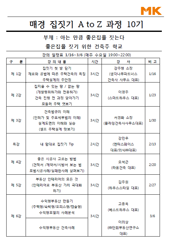 집 짓기에 관심 있는 일반인, 예비 건축주를 대상으로 한 매경 집짓기 A to Z 과정 10기(2019년 1월 16일~2020년 3월 6일)에 강사로 참여합니다.