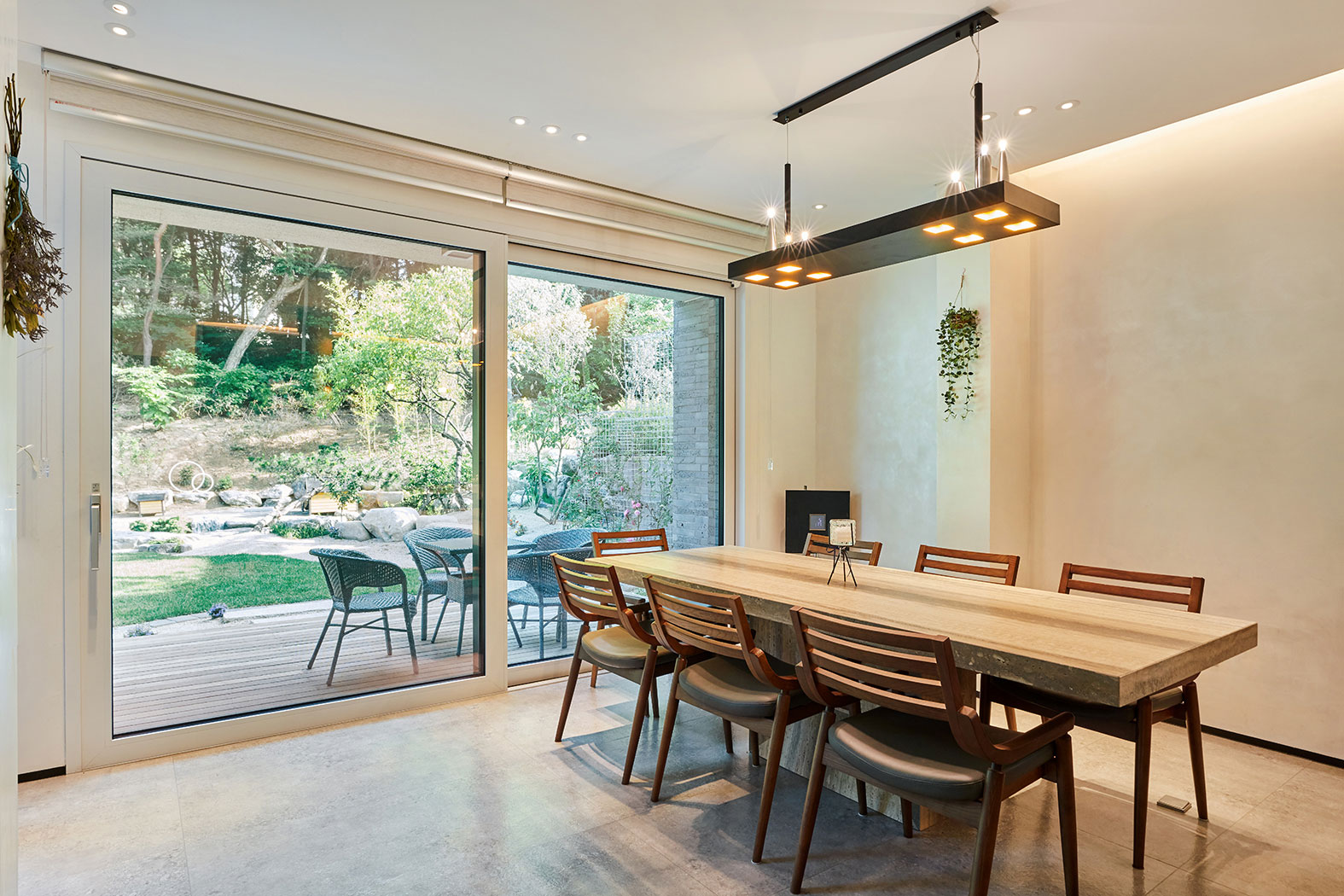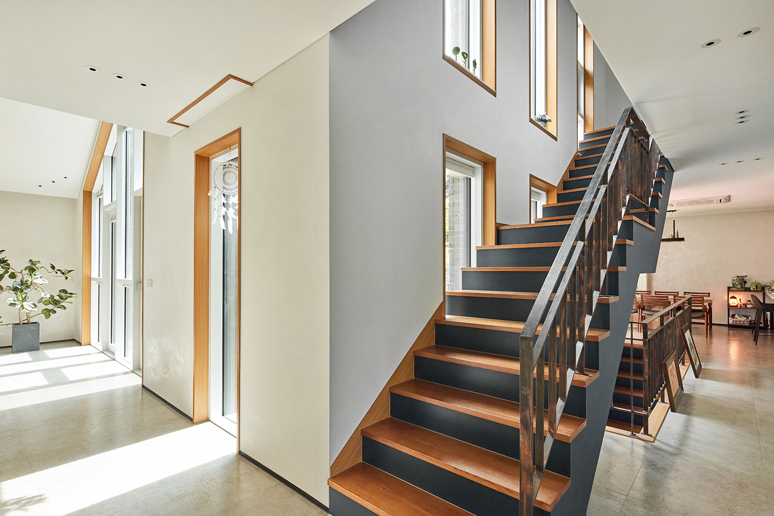 계단실이 몸통이라면 거실과 식당/주방은 두 팔에 해당된다. 또 그곳에 접해 데크, 마당이 자연스레 연결되는데 파티하기에 안성맞춤이다. 사람이 좋아 늘 손님으로 가득 찬 집. 이름대로 “Welcome House”가 되었다.