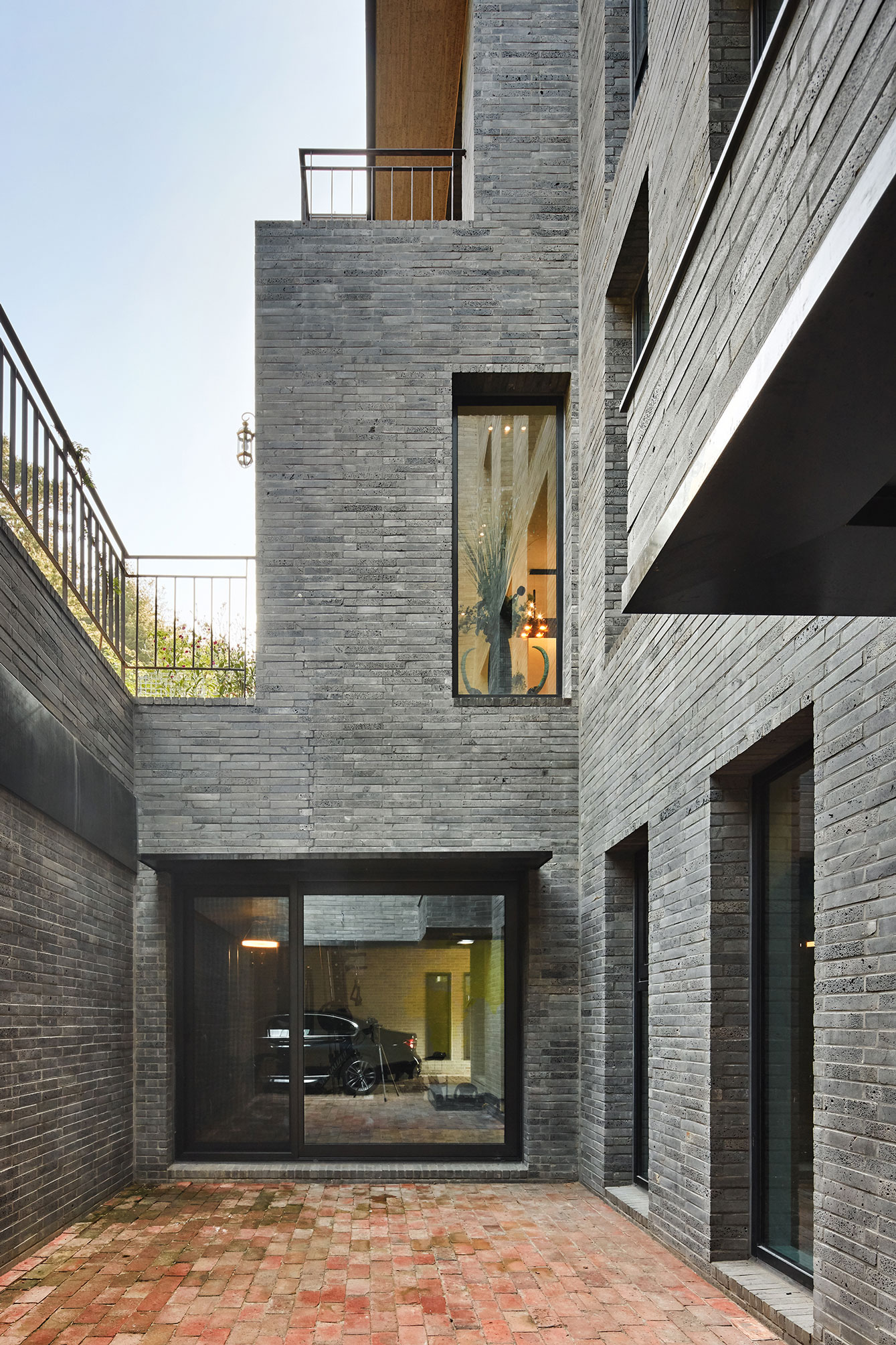 외장재는 당초 두라스텍의 디자인 블록 혹은 큼지막한 세로 패턴의 밝은 화강석을 고려했으나 건축주의 요청으로 현무암 벽돌을 적용했다. 덕분에 견고한 구축미가 동반된 무게감 있는 주택이 되었다. 부분적으로 송판 노출콘크리트와 포인트로 따뜻한 느낌의 박판 세라믹패널 및 목재를 더하였다. 지붕은 징크를 적용했다.