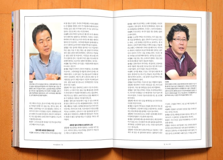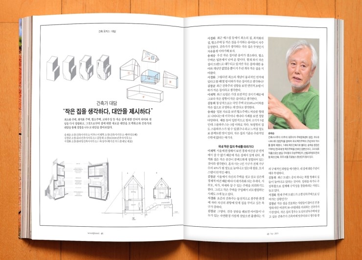 매거진 우드플래닛 2015년 9월호에 건축가 대담 "작은 집을 생각하다, 대안을 제시하다" 기사가 실렸습니다. 집에 대한 여러 언어적 의미와 개념을 재정립해보고 집에 대한 새로운 대안을 모색해보는 자리였습니다. 이번 대담을 통해 집에 대한 새로운 시각을 알게 되어 의미가 있는 시간이었습니다.