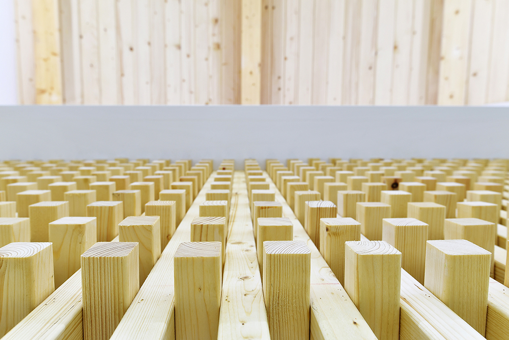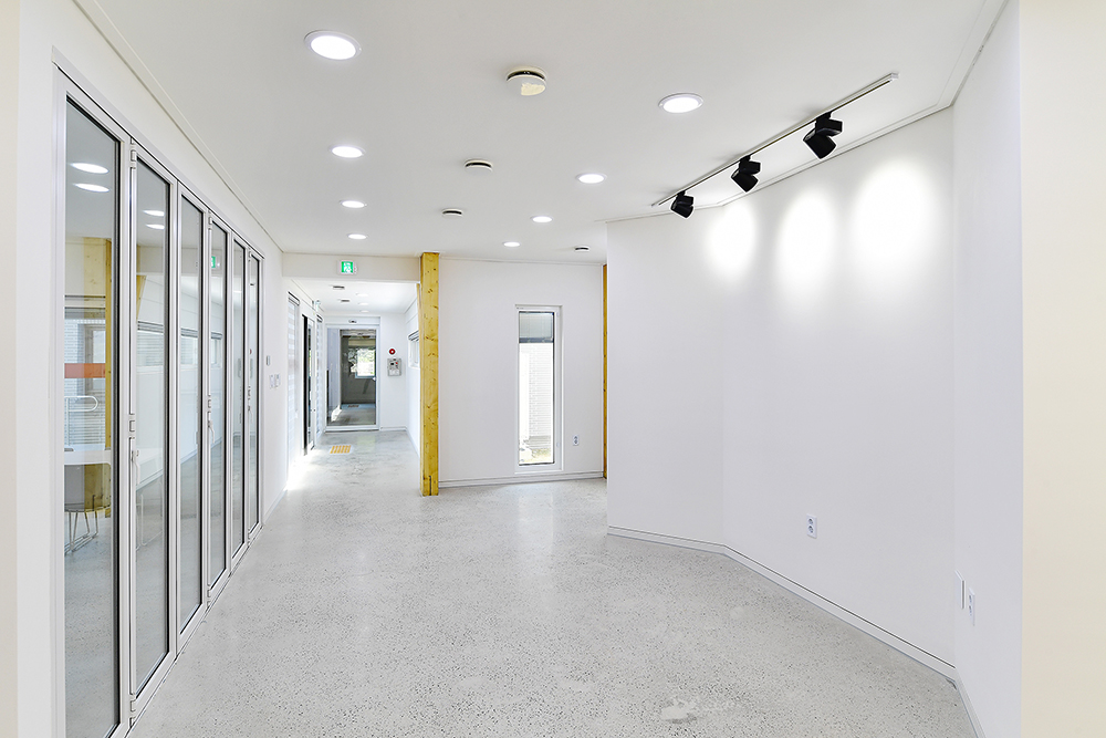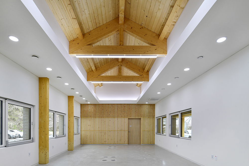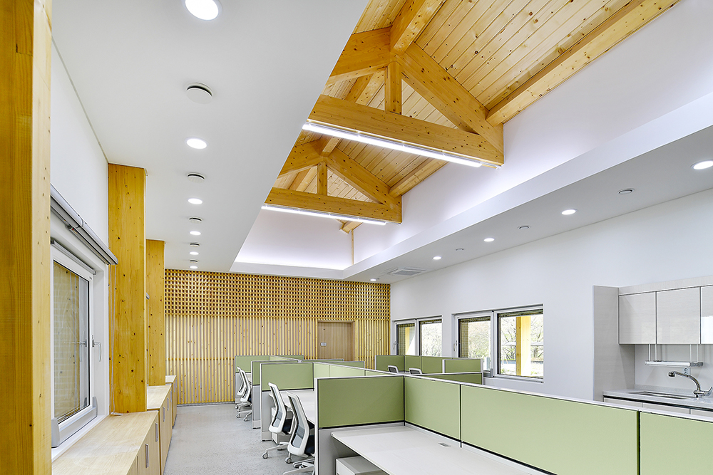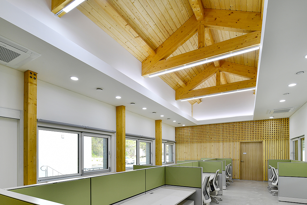 내부 마감에도 일부 벽체에 나무 각재를 격자로 돌출시키는 등 중목구조와의 시너지를 고려하였다. 백색의 벽체에 나무의 따뜻함과 고유의 질감이 더해지니 다소 딱딱할 수 있는 업무공간이 한층 산뜻해졌다.