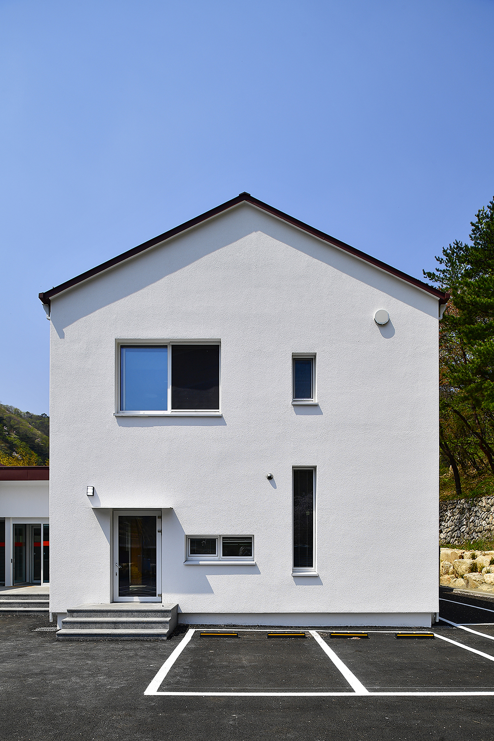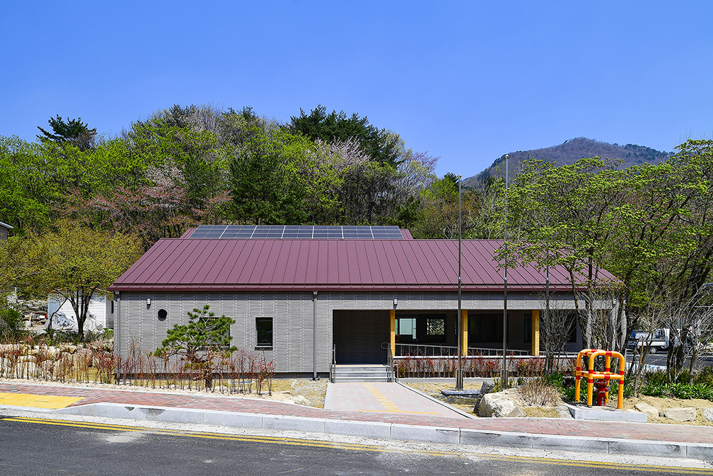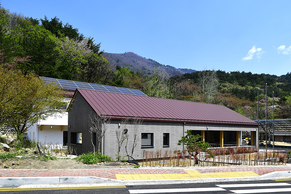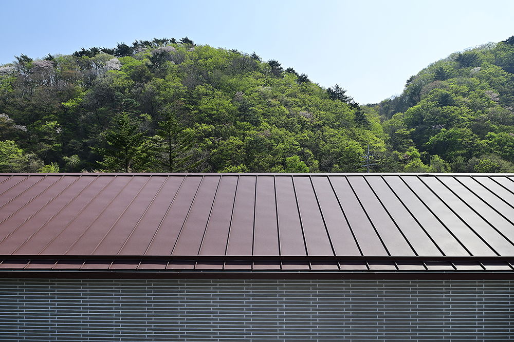 더불어 산자락에 면해 거대해 보이는 걸 지양하고자, 기능적으로 분리한 매스는 관공서라기보다는 차라리 집의 이미지에 가깝게 디자인했다. 최대한 단순히 그리고 산을 닮은 경사지붕은 신축 건물임에도 불구하고 마치 그 자리에 이미 자리하고 있었던 것처럼 주변 산에 잘 스며들었다. 수수하고 담담한 모습으로.