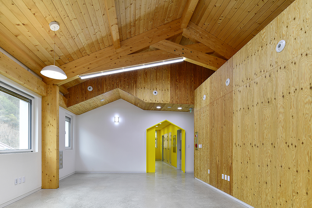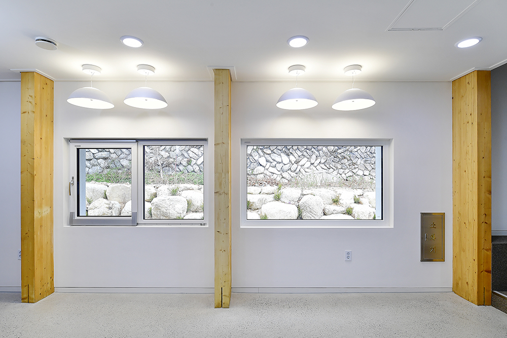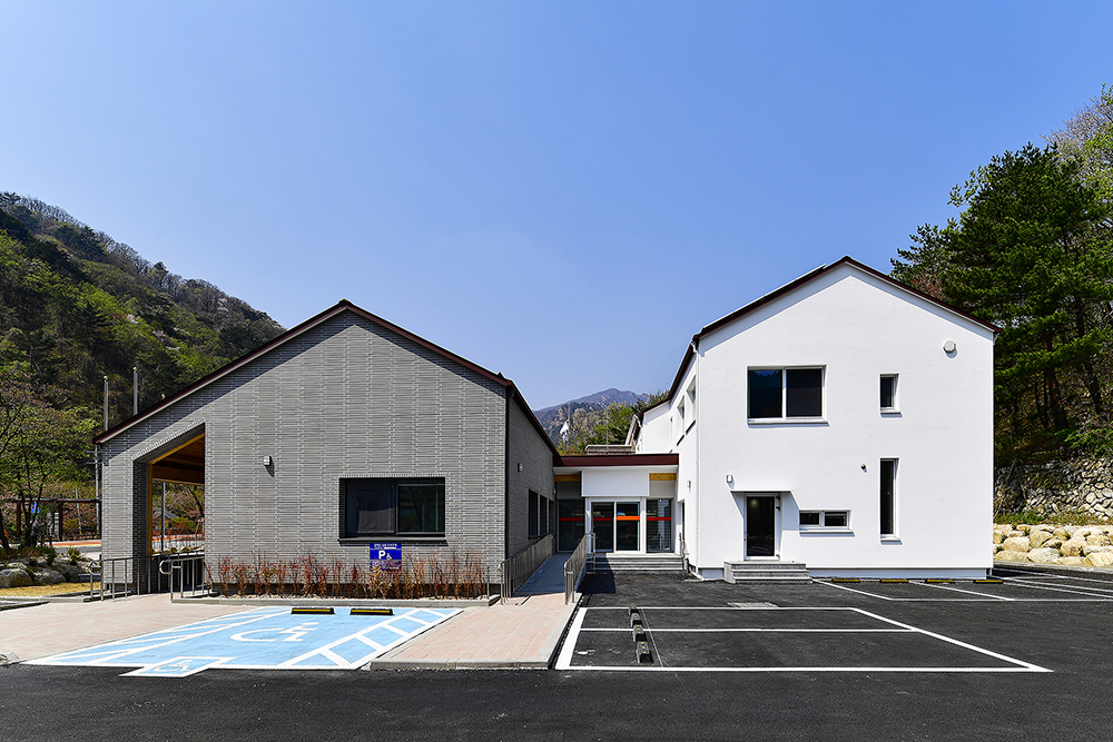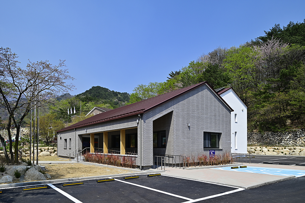 더불어 산자락에 면해 거대해 보이는 걸 지양하고자, 기능적으로 분리한 매스는 관공서라기보다는 차라리 집의 이미지에 가깝게 디자인했다. 최대한 단순히 그리고 산을 닮은 경사지붕은 신축 건물임에도 불구하고 마치 그 자리에 이미 자리하고 있었던 것처럼 주변 산에 잘 스며들었다. 수수하고 담담한 모습으로.