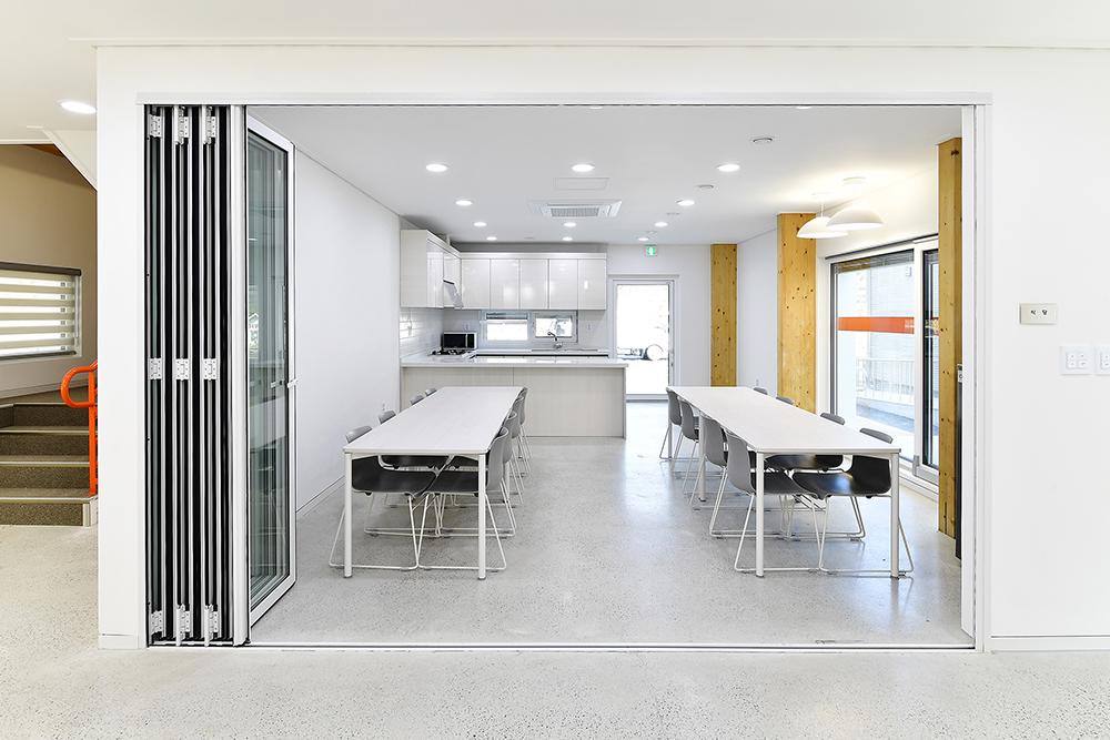 빛과 바람과 단열, 환기 등 쾌적한 공간을 만들기 위해 열교를 극복하고 우수한 단열성능 자재 특히, 셀룰로오즈 단열재를 지붕에 적용해보기도 하고 기밀시공 등 다양한 패시브적인 요소가 설계와 시공에 반영되었다. 제로에너지 인증을 충족하기 위해 주차장의 지붕과 후면 매스의 지붕에 태양광패널을 설치하는 등 액티브적인 요소까지 추가되어 기능적으로 매우 우수한 건물이 되었다. 이렇듯 복합적인 기술을 도입하면서 디자인 등 고려할 부분이 많았지만 목재를 적절히 활용하면서 미적인 부분을 담아내려 노력하였다.