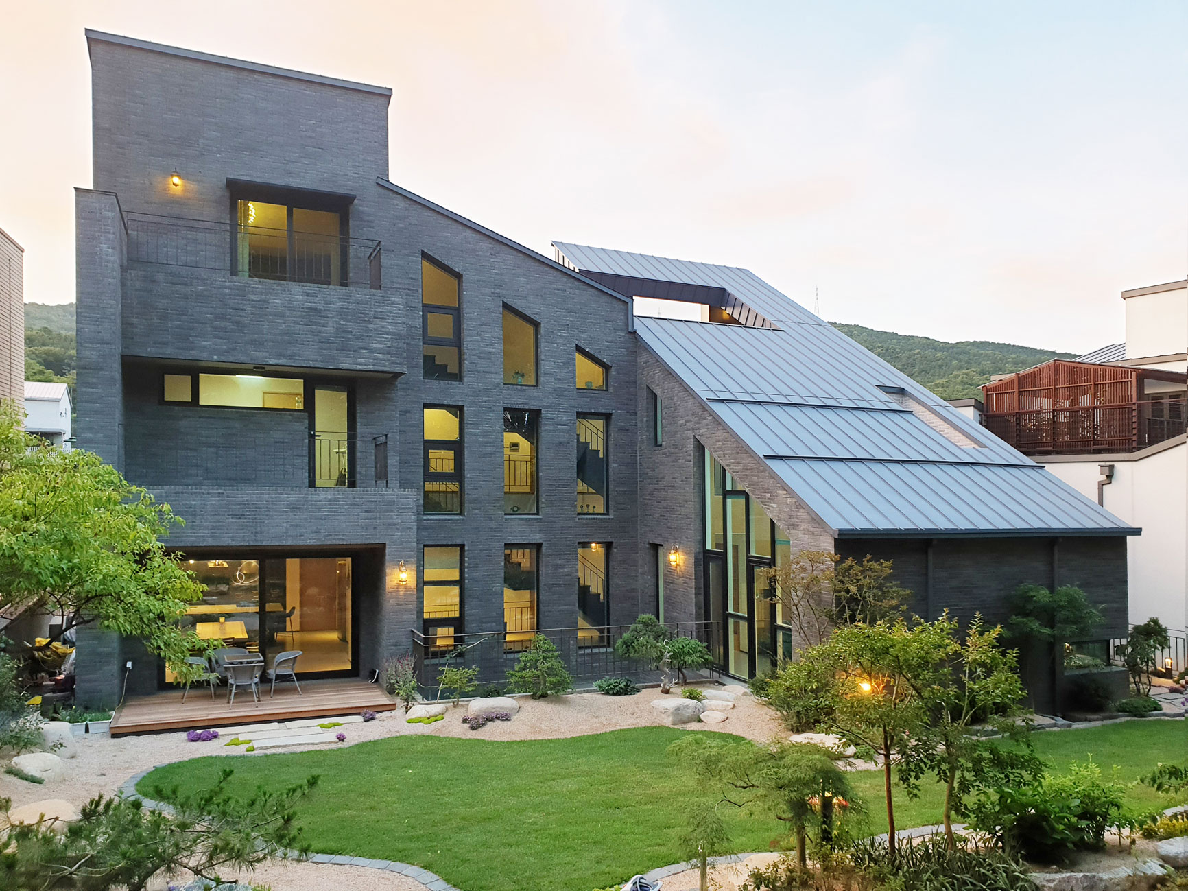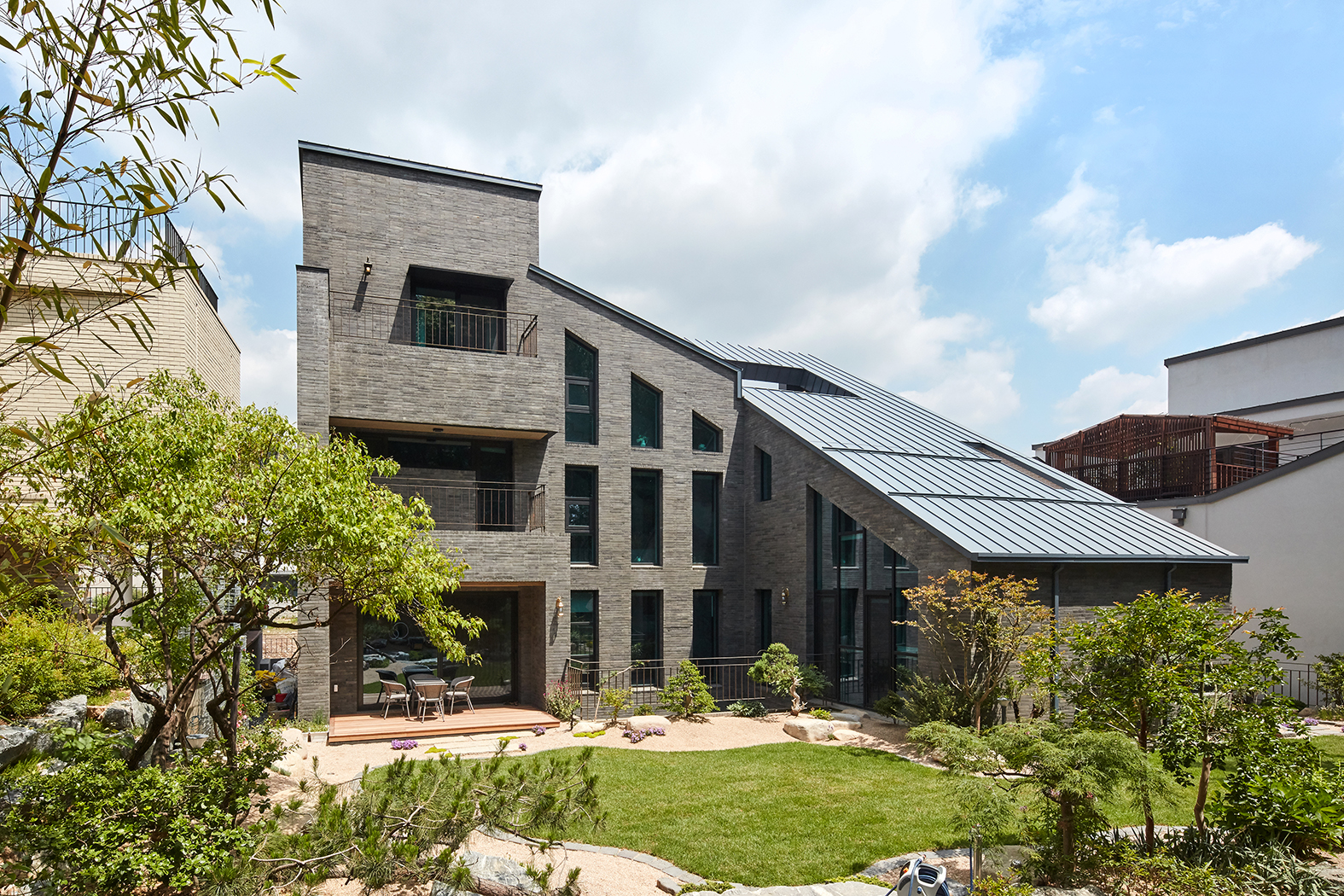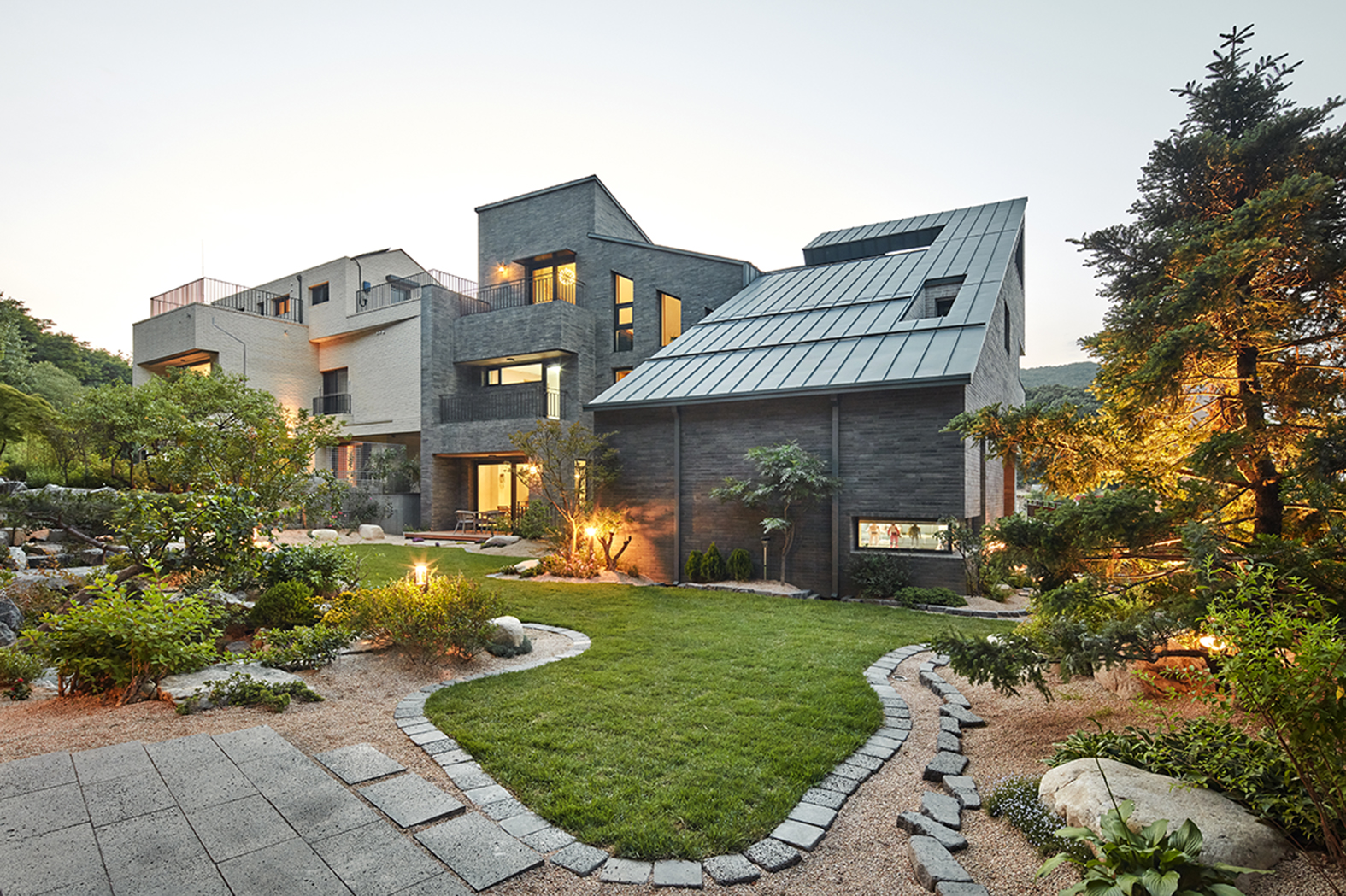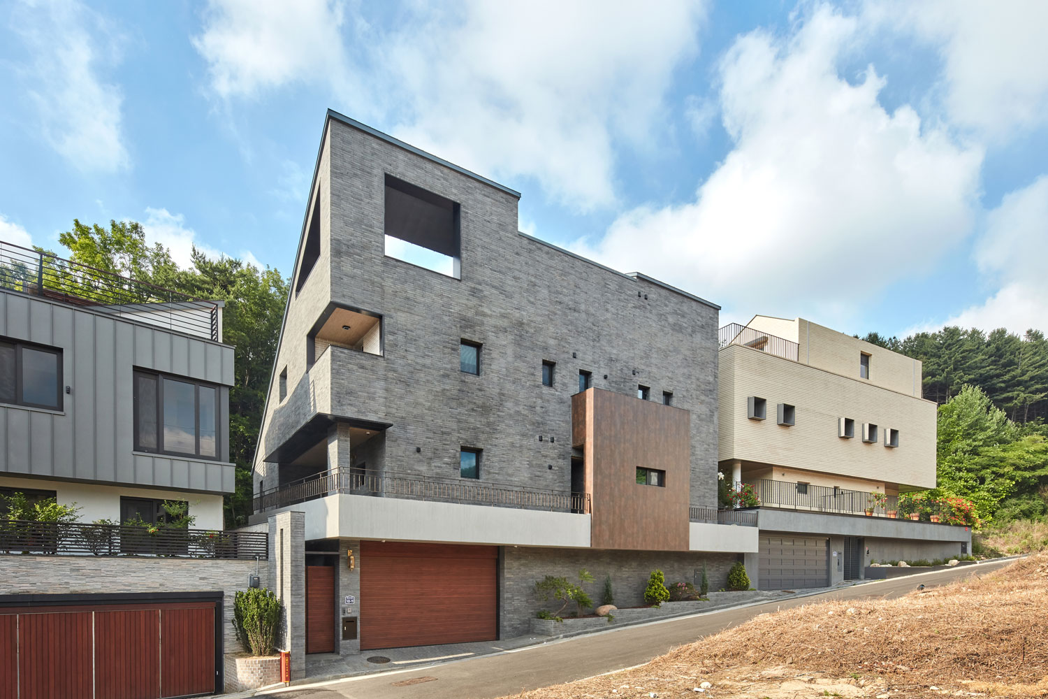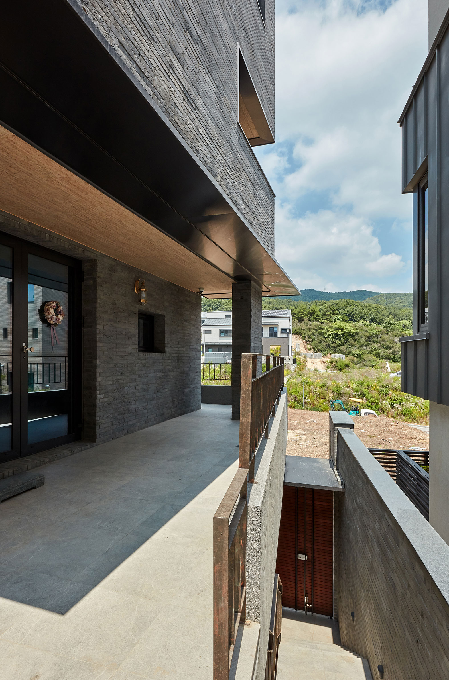 외장재는 당초 두라스텍의 디자인 블록 혹은 큼지막한 세로 패턴의 밝은 화강석을 고려했으나 건축주의 요청으로 현무암 벽돌을 적용했다. 덕분에 견고한 구축미가 동반된 무게감 있는 주택이 되었다. 부분적으로 송판 노출콘크리트와 포인트로 따뜻한 느낌의 박판 세라믹패널 및 목재를 더하였다. 지붕은 징크를 적용했다.