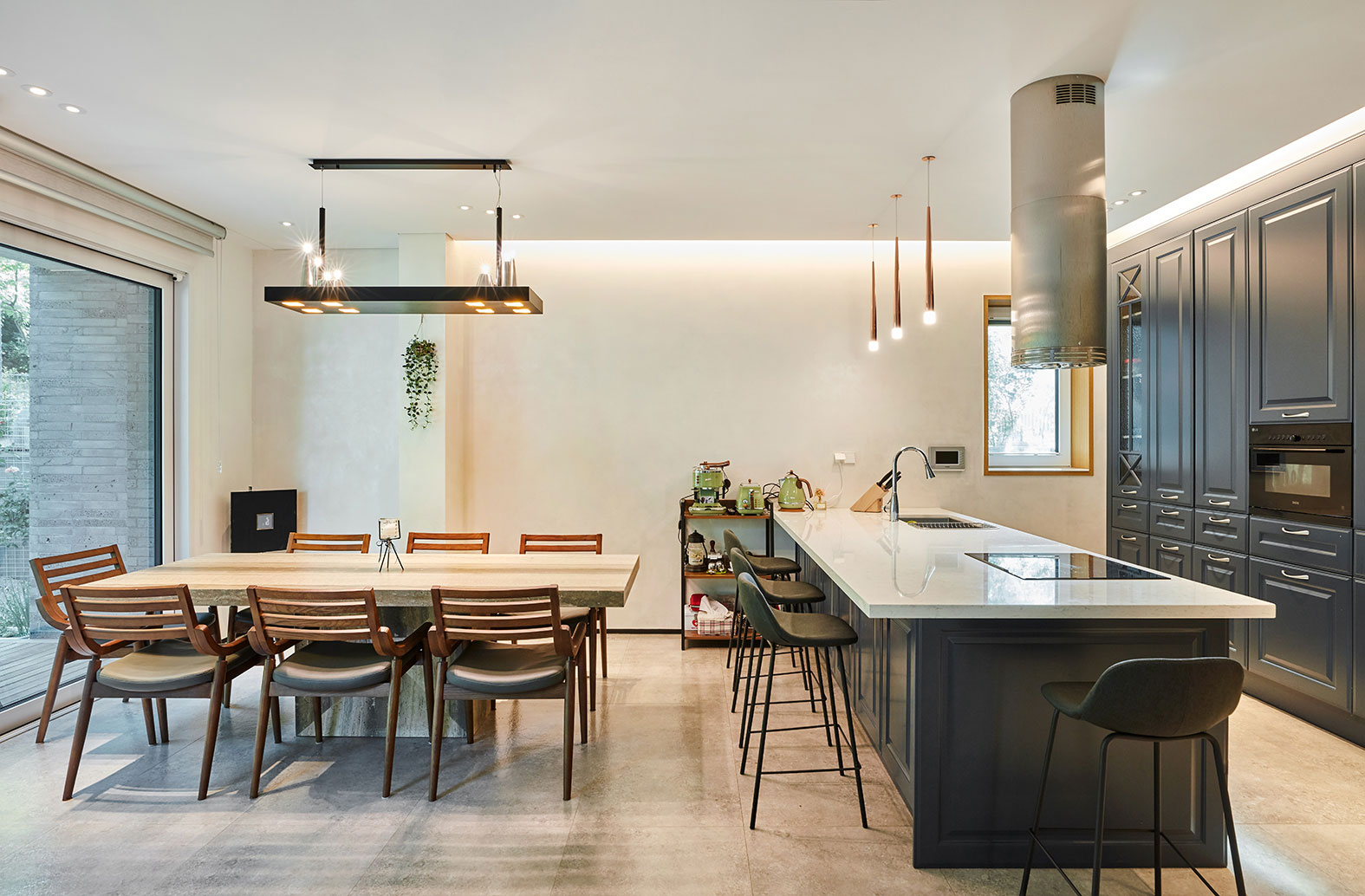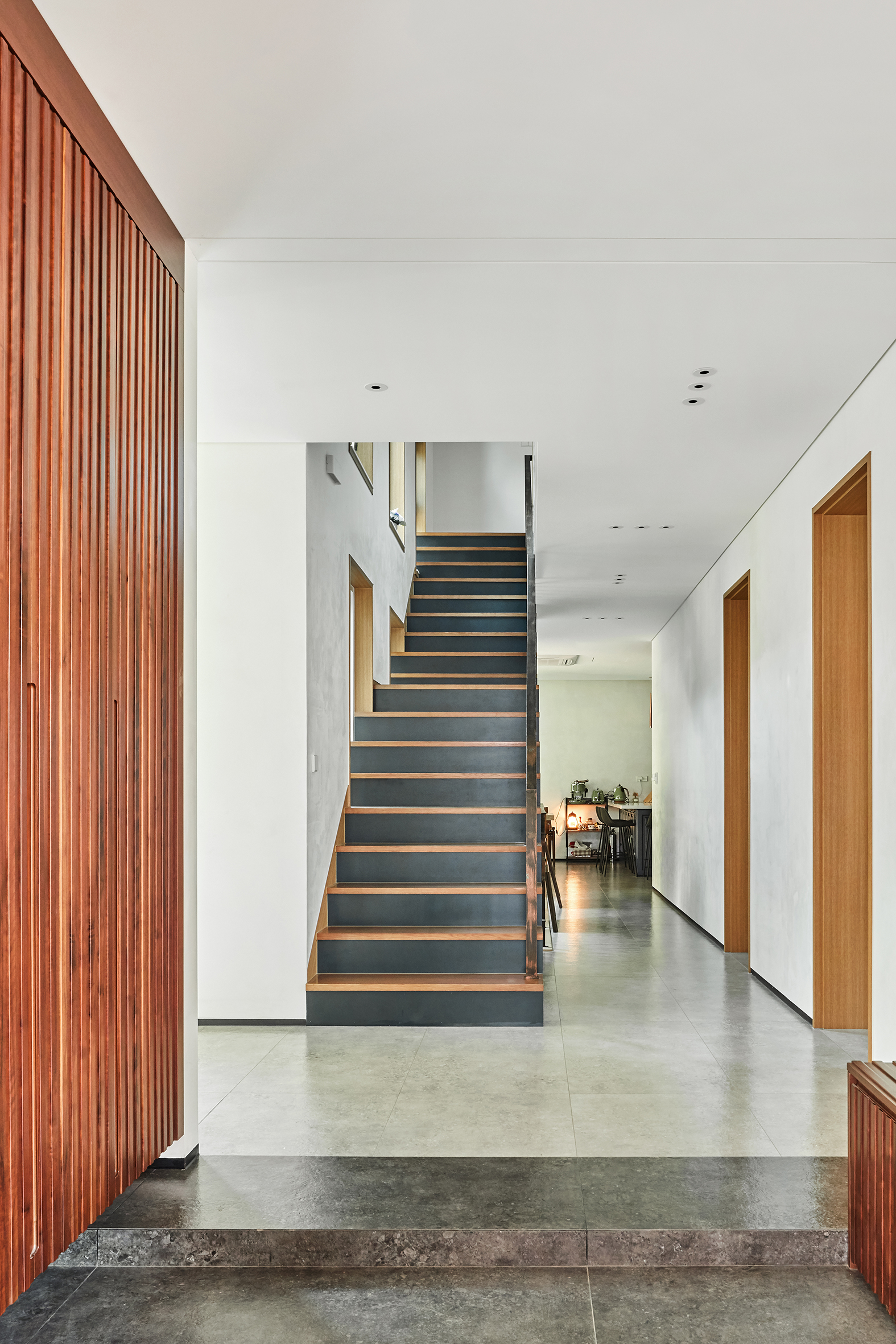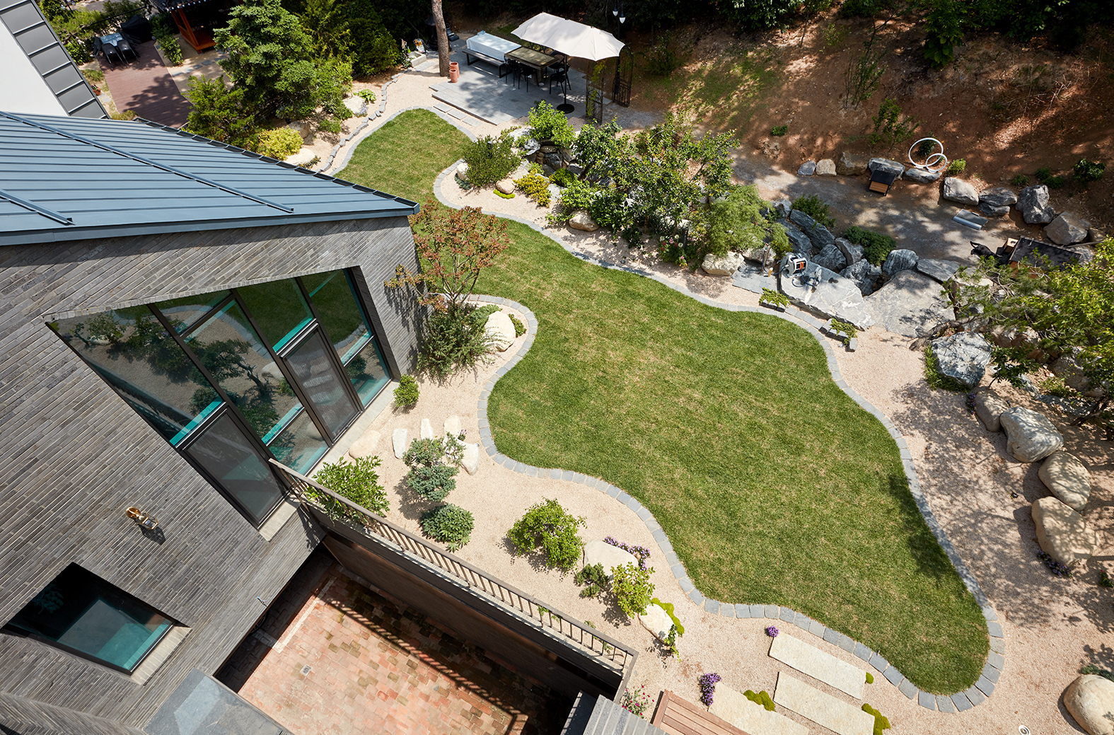 계단실이 몸통이라면 거실과 식당/주방은 두 팔에 해당된다. 또 그곳에 접해 데크, 마당이 자연스레 연결되는데 파티하기에 안성맞춤이다. 사람이 좋아 늘 손님으로 가득 찬 집. 이름대로 “Welcome House”가 되었다.
