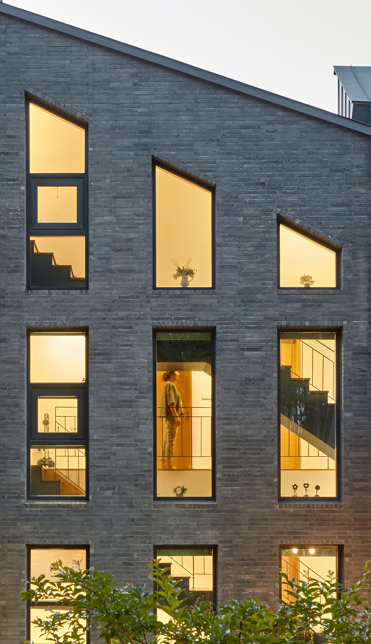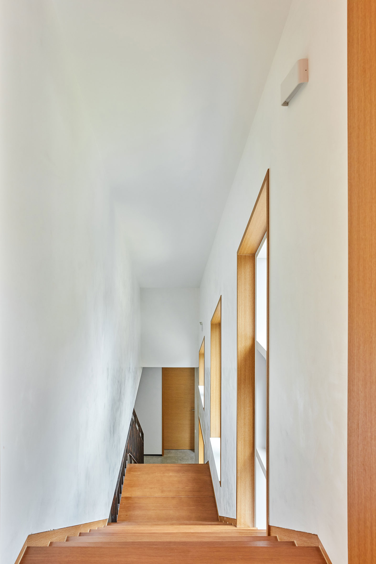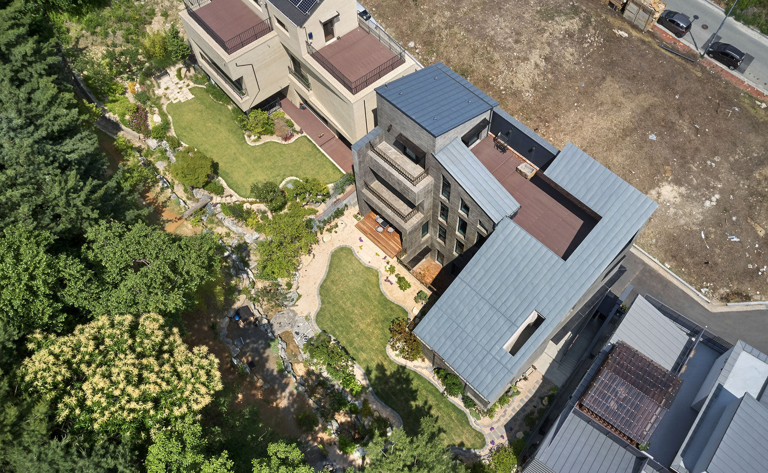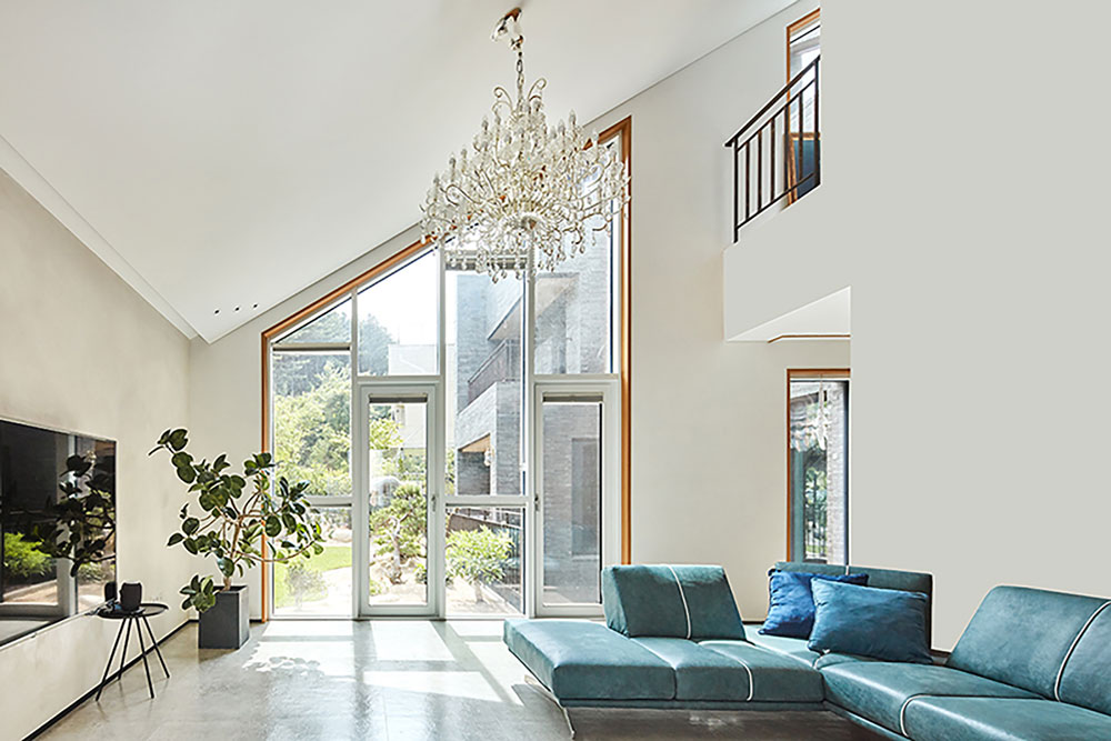 대지는 남북으로 사다리꼴 형상을 하고 있다. 북측 도로보다 한 개 층 높은 위치에 지면이 형성되어 있고 남측은 공원에 면해 있다. 전망이 좋은 남향을 바라보고 공원까지 위치하니 주택으로서 최상의 조건이다. 하지만 공원 등산로에서 집이 훤히 보이는 구조이므로 프라이버시가 담보된 공간이 설계의 관건이었다. 따라서 전체 건물은 “ㄷ”자 형태로, 외부의 시선과 바로 만나는 가운데 부분은 비교적 공적인 공간인 계단실을 계획하여 양측의 공간과 수직의 공간을 잇도록 계획했다. 거실도 남향에 면하되 주된 창은 서측으로 오픈하여 외부의 시선에서 보다 자유롭게 생활이 가능하도록 했다.